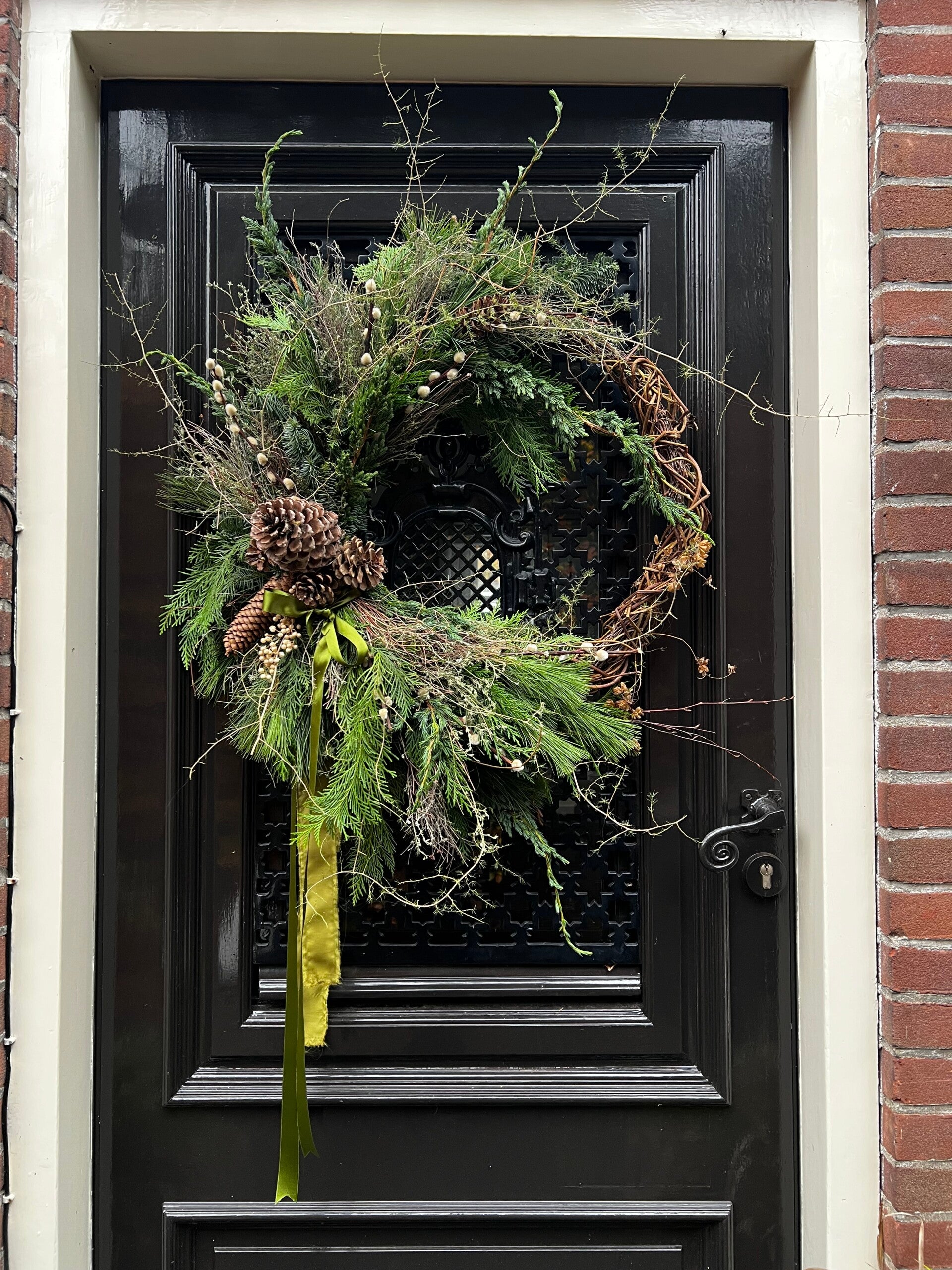 Deze kerstkrans, bestaande uit o.a. coniferen, wilde asperagus en tijm, kan je komen maken in mijn eigen atelier in Lochem op: